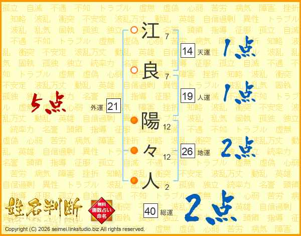 江(7画)良(7画) 陽(12画)々(12画)人(2画)