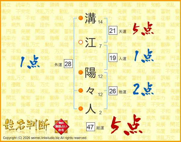 生活面を象徴する運勢です。外部から受ける影響力を表し、結婚運、家庭運や職場、環境への順応性を表します。総運から人運を引いた画数。姓や名が1文字の場合を除く。