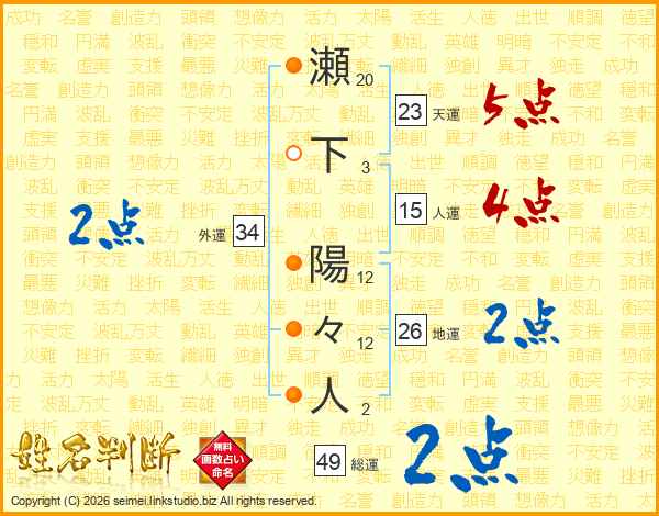 瀬(20画)下(3画) 陽(12画)々(12画)人(2画)