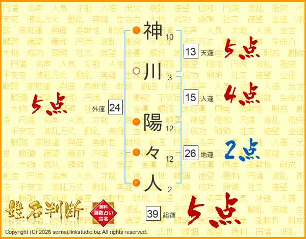 神(10画)川(3画) 陽(12画)々(12画)人(2画)