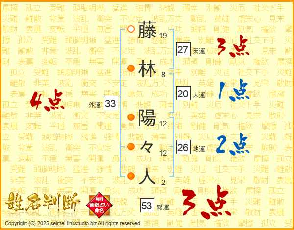 藤(19画)林(8画) 陽(12画)々(12画)人(2画)