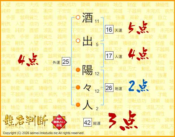 酒(11画)出(5画) 陽(12画)々(12画)人(2画)