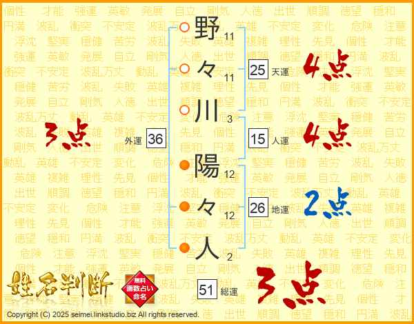 生活面を象徴する運勢です。外部から受ける影響力を表し、結婚運、家庭運や職場、環境への順応性を表します。総運から人運を引いた画数。姓や名が1文字の場合を除く。