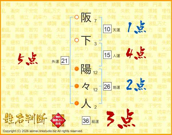 阪(7画)下(3画) 陽(12画)々(12画)人(2画)