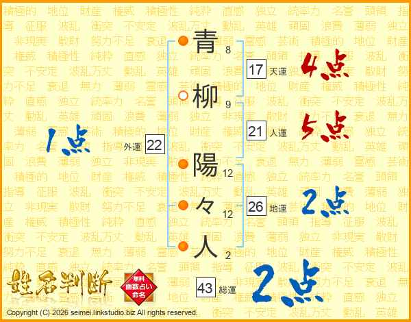 青柳陽々人さんの総運は43画の2点!
