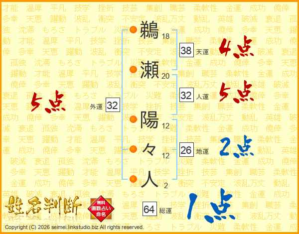 鵜(18画)瀬(20画) 陽(12画)々(12画)人(2画)