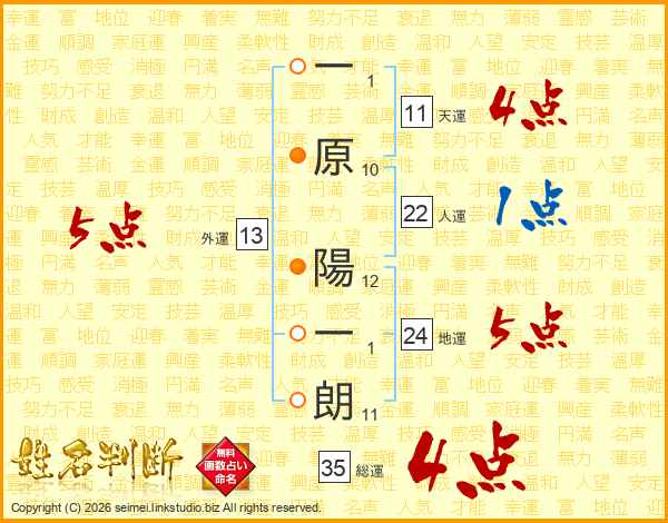一(1画)原(10画) 陽(12画)一(1画)朗(11画)