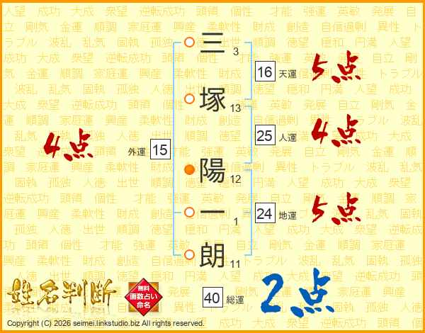三(3画)塚(13画) 陽(12画)一(1画)朗(11画)