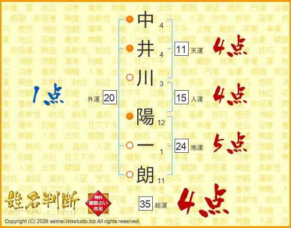 中(4画)井(4画)川(3画) 陽(12画)一(1画)朗(11画)