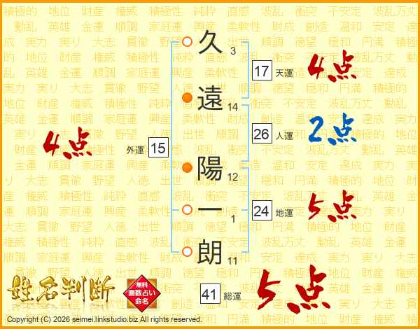 久(3画)遠(14画) 陽(12画)一(1画)朗(11画)