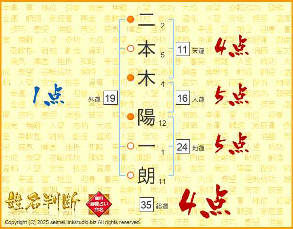 二(2画)本(5画)木(4画) 陽(12画)一(1画)朗(11画)