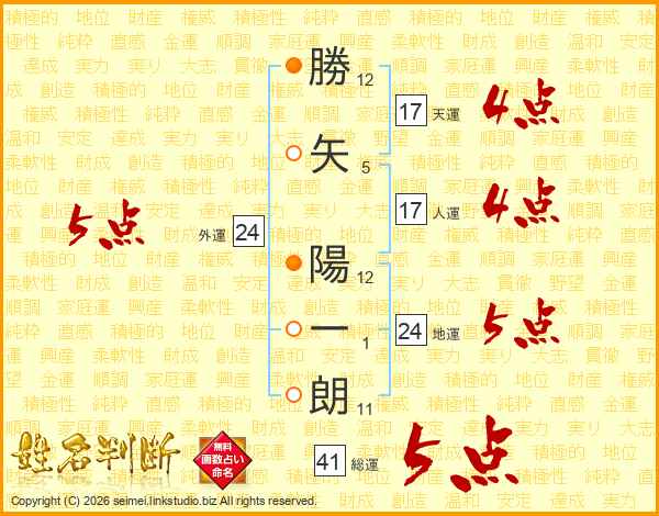 勝(12画)矢(5画) 陽(12画)一(1画)朗(11画)