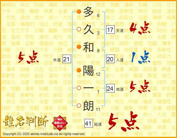 多(6画)久(3画)和(8画) 陽(12画)一(1画)朗(11画)
