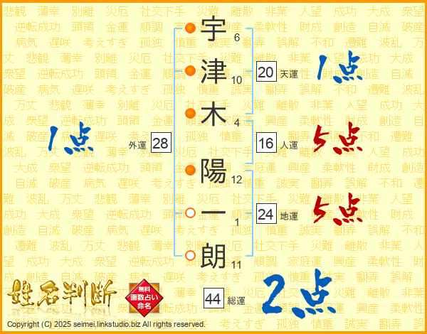 宇(6画)津(10画)木(4画) 陽(12画)一(1画)朗(11画)