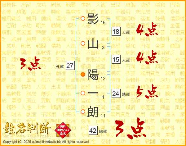 影(15画)山(3画) 陽(12画)一(1画)朗(11画)