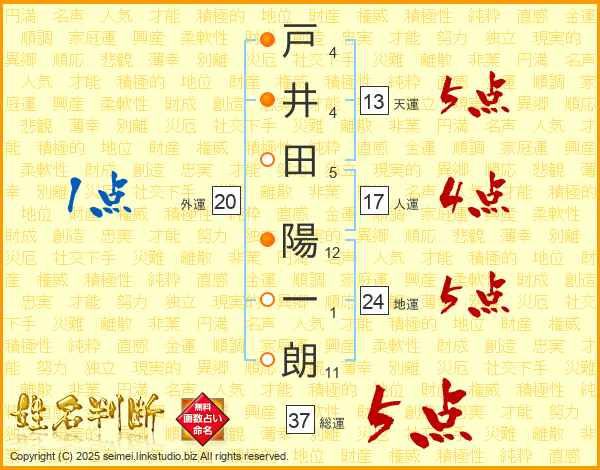 戸(4画)井(4画)田(5画) 陽(12画)一(1画)朗(11画)