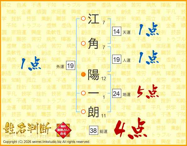 江(7画)角(7画) 陽(12画)一(1画)朗(11画)
