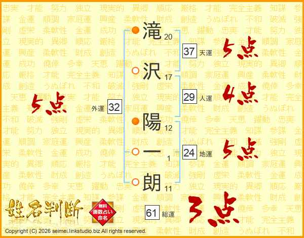 滝(20画)沢(17画) 陽(12画)一(1画)朗(11画)