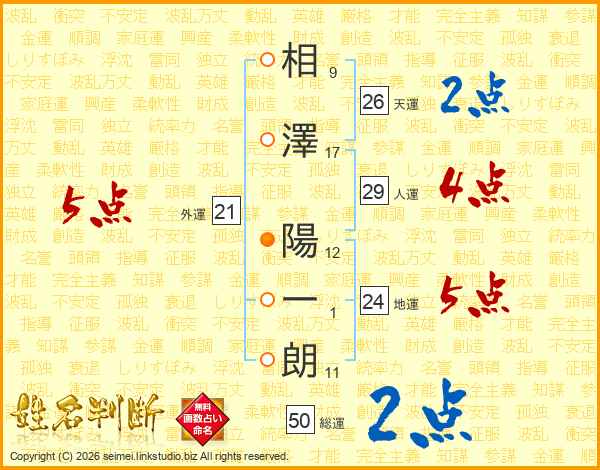 相(9画)澤(17画) 陽(12画)一(1画)朗(11画)