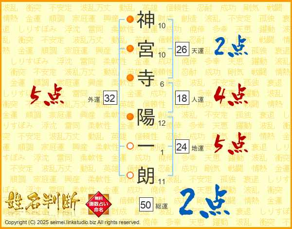 神(10画)宮(10画)寺(6画) 陽(12画)一(1画)朗(11画)