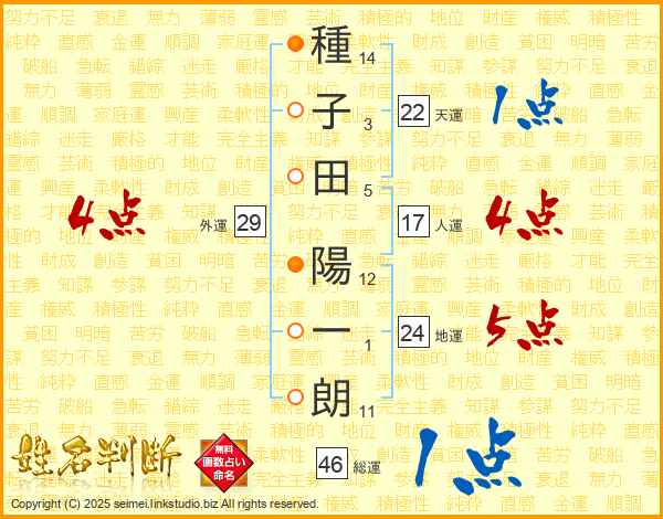 種(14画)子(3画)田(5画) 陽(12画)一(1画)朗(11画)