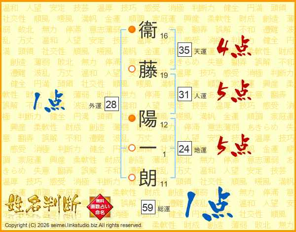 衞(16画)藤(19画) 陽(12画)一(1画)朗(11画)