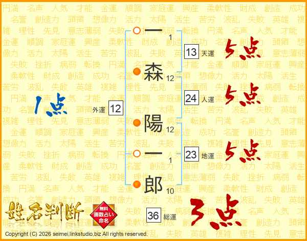 一(1画)森(12画) 陽(12画)一(1画)郎(10画)