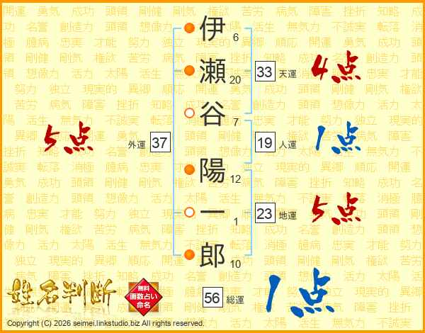 伊(6画)瀬(20画)谷(7画) 陽(12画)一(1画)郎(10画)