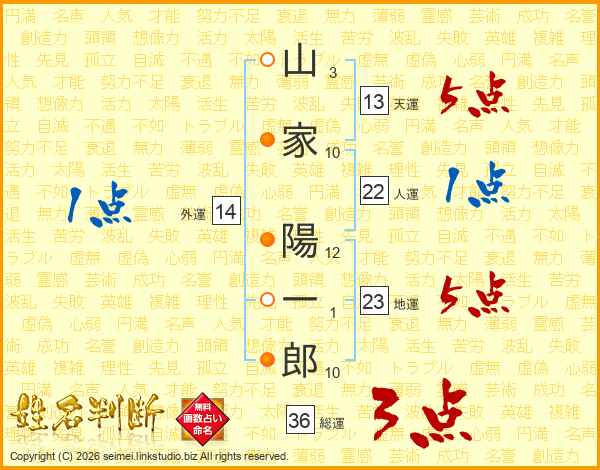 山(3画)家(10画) 陽(12画)一(1画)郎(10画)
