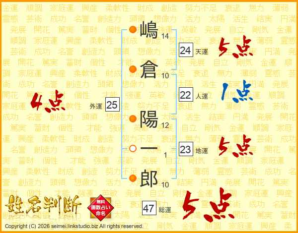 嶋(14画)倉(10画) 陽(12画)一(1画)郎(10画)