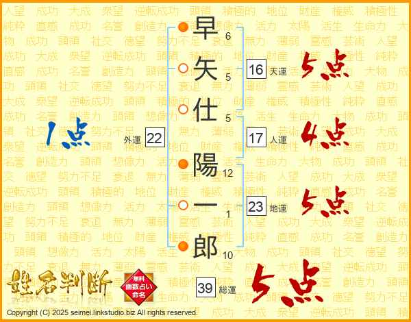 早(6画)矢(5画)仕(5画) 陽(12画)一(1画)郎(10画)