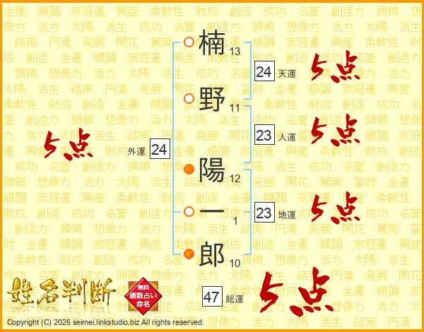 楠野陽一郎さんの総運は47画の5点!