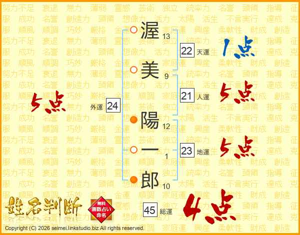 渥(13画)美(9画) 陽(12画)一(1画)郎(10画)