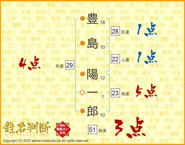 豊(18画)島(10画) 陽(12画)一(1画)郎(10画)