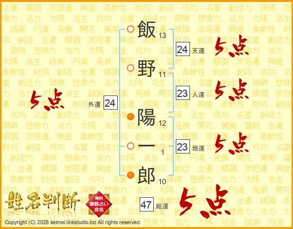 飯(13画)野(11画) 陽(12画)一(1画)郎(10画)
