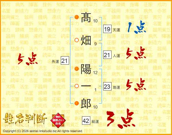 髙(10画)畑(9画) 陽(12画)一(1画)郎(10画)