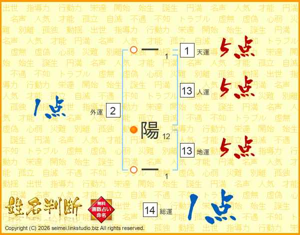 画数の奇数(○陽)と偶数(●陰)の配列で吉凶を占います。どちらかにかたよる名前は大凶名で避ける必要があります。画数の奇数偶数。