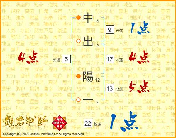 生活面を象徴する運勢です。外部から受ける影響力を表し、結婚運、家庭運や職場、環境への順応性を表します。総運から人運を引いた画数。姓や名が1文字の場合を除く。
