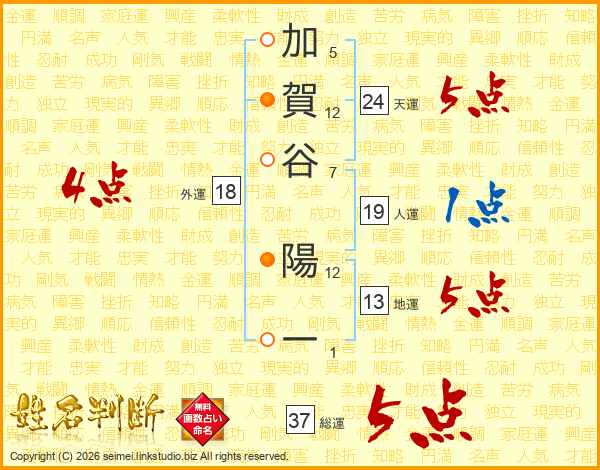 加賀谷陽一さんの総運は37画の5点!