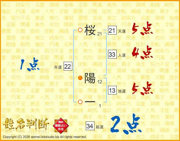 画数の奇数(○陽)と偶数(●陰)の配列で吉凶を占います。どちらかにかたよる名前は大凶名で避ける必要があります。画数の奇数偶数。