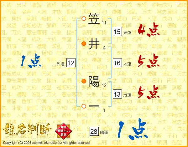 笠(11画)井(4画) 陽(12画)一(1画)