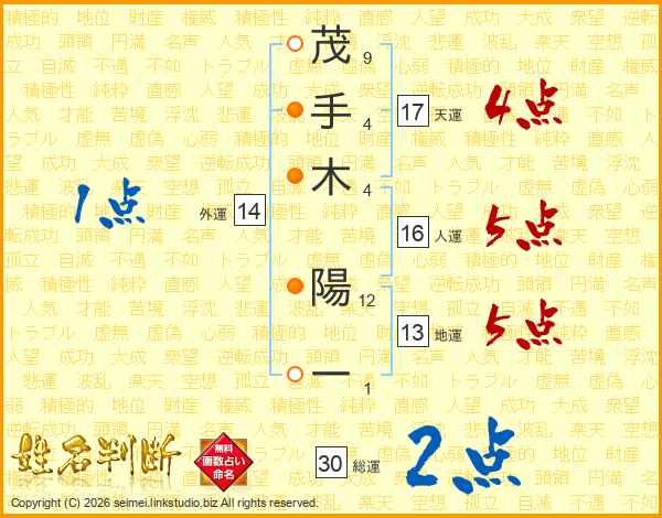 茂(9画)手(4画)木(4画) 陽(12画)一(1画)