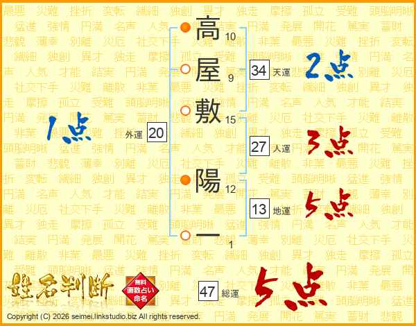 高屋敷陽一さんの総運は47画の5点!