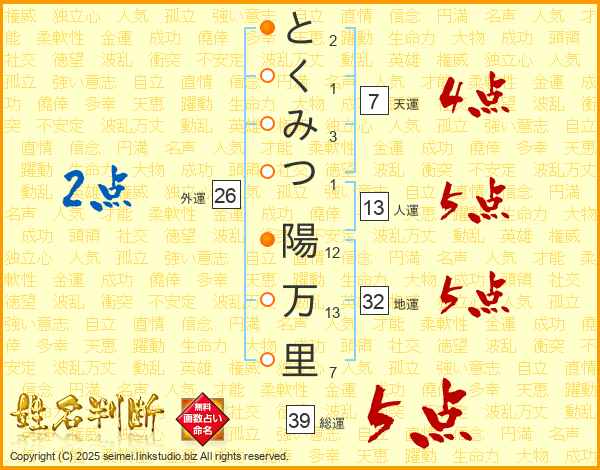 とくみつ陽万里さんの総運は39画の5点!