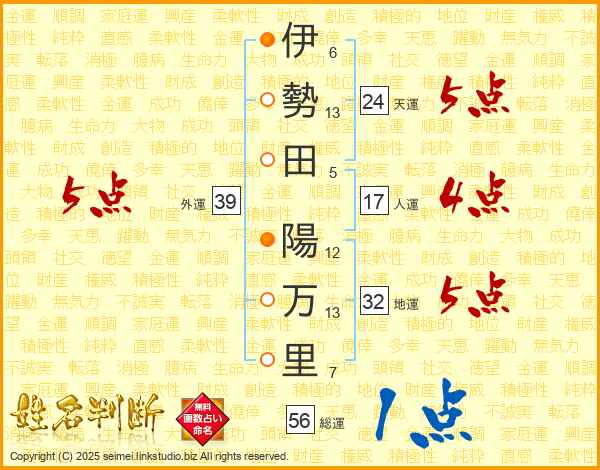 伊(6画)勢(13画)田(5画) 陽(12画)万(13画)里(7画)