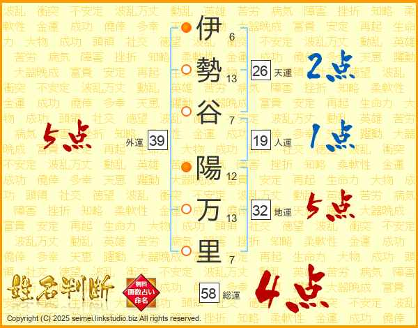 伊(6画)勢(13画)谷(7画) 陽(12画)万(13画)里(7画)