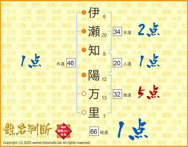 伊(6画)瀬(20画)知(8画) 陽(12画)万(13画)里(7画)