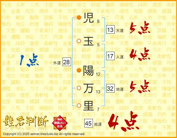 児(8画)玉(5画) 陽(12画)万(13画)里(7画)