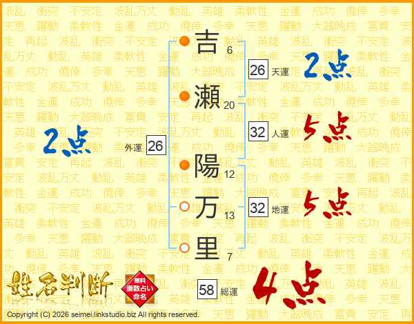 吉瀬陽万里さんの総運は58画の4点!