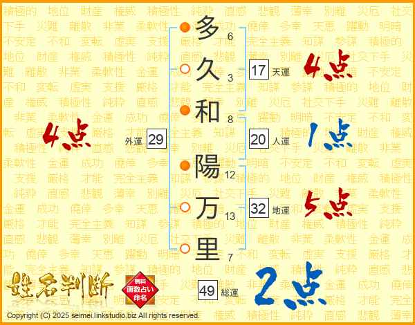 多久和陽万里さんの総運は49画の2点!
